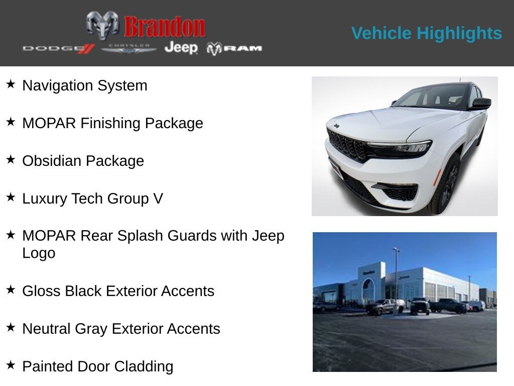 New Price! Bright White Clearcoat 2025 Jeep Grand Cherokee Summit 4WD 8-Speed Automatic 3.6L V6 24V VVT 4WD, 2nd-Row Manual Window Shades, Gloss Black Exterior Accents, Luxury Tech Group V, MOPAR Finishing Package, MOPAR Front Splash Guards, MOPAR Paint Protection Film, MOPAR Rear Splash Guards with Jeep Logo, Navigation System, Neutral Gray Exterior Accents, Obsidian Package, Painted Door Cladding, Wheels: 21" x 9" Black Painted Aluminum, Wireless Charging Pad.