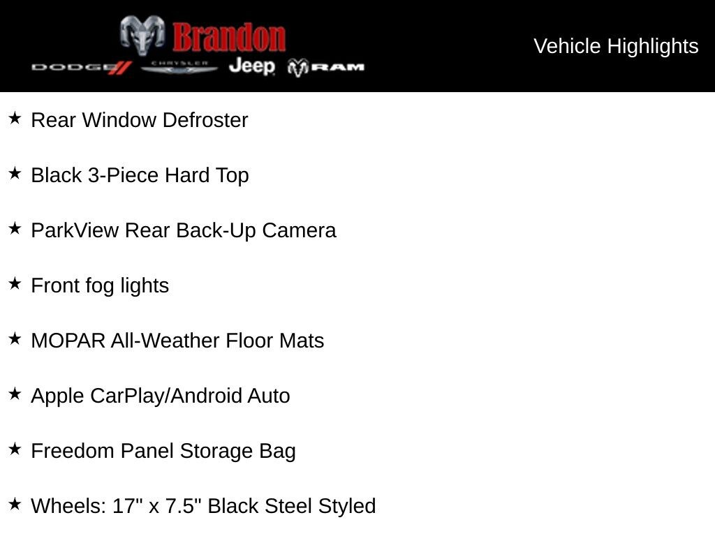 New Price! granite crystal metallic clearcoat 2026 Jeep Wrangler Sport 4WD 8-Speed Automatic 2.0L I4 DOHC Apple CarPlay/Android Auto, Black 3-Piece Hard Top, Freedom Panel Storage Bag, Front fog lights, MOPAR All-Weather Floor Mats, ParkView Rear Back-Up Camera, Rear Window Defroster, Rear Window Wiper/Washer, Wheels: 17" x 7.5" Black Steel Styled.