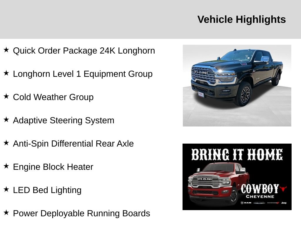 Diamond Black Crystal Pearlcoat 2025 Ram 2500 Limited 4WD 8-Speed Automatic 6.7L I6 Active Lane Management System, Adaptive Steering System, Anti-Spin Differential Rear Axle, Cold Weather Group, CTR Stop Lamp w/Cargo View Camera, Digital Rearview Mirror, Drowsy Driver Detection, Engine Block Heater, LED Bed Lighting, Longhorn Instrument Cluster Theme 3, Longhorn Level 1 Equipment Group, MOPAR Spray In Bedliner, MOPAR Winter Front Grille Cover, Power Deployable Running Boards, Quick Order Package 24K Longhorn, Surround View Camera System, Traffic Sign Recognition, Trailer Reverse Guidance, Trailer Tire Pressure Monitoring System. Price includes: $2000 - 2025 National Bonus Cash . Exp. 11/03/2025