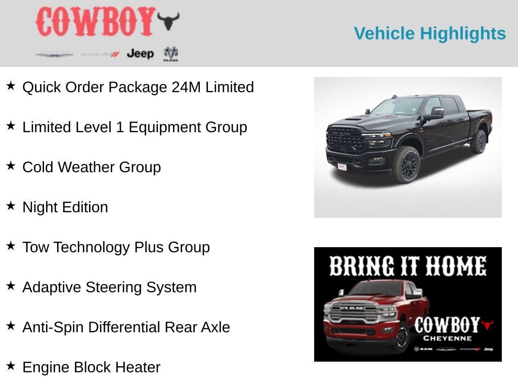 Diamond Black Crystal Pearlcoat 2026 Ram 2500 Limited 4WD 8-Speed Automatic 6.7L I6 Active Lane Management System, Adaptive Steering System, Anti-Spin Differential Rear Axle, Black Exterior Truck Badging, Black Interior Accents, Black Limited Grille, Black Wheel Center Hub, Body Color Grille Surround, Center Stop Lamp with Cargo View Camera, Cold Weather Group, Digital 3.0 Rear View Auto Dimming Mirror, Digital Rearview Mirror, Drowsy Driver Detection, Engine Block Heater, LED Bed Lighting, Limited Level 1 Equipment Group, MOPAR Spray in Bedliner, MOPAR Winter Front Grille Cover, Night Edition, Power Deployable Running Boards, Quick Order Package 24M Limited, Sport Performance Hood, Surround View Camera System, Tow Technology Plus Group, Traffic Sign Recognition, Trailer Reverse Guidance, Trailer Reverse Steering Control, Trailer Tire Pressure Monitoring System, Wheels: 20" x 8" Night Edition Black Aluminum.