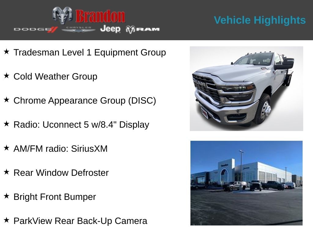 Bright White Clearcoat 2026 Ram 3500 Tradesman 4WD 8-Speed Automatic Cummins 6.7L I6 Turbodiesel AM/FM radio: SiriusXM, Bright Front Bumper, Chrome Appearance Group (DISC), Cold Weather Group, Dual Rear Wheels, Engine Block Heater, Front fog lights, Fully automatic headlights, ParkView Rear Back-Up Camera, Radio: Uconnect 5 w/8.4" Display, Rear Window Defroster, Tradesman Level 1 Equipment Group, Trailer Brake Control, Trailer Light Check, Variably intermittent wipers, Wheels: 18" x 8.0" Polished Aluminum.