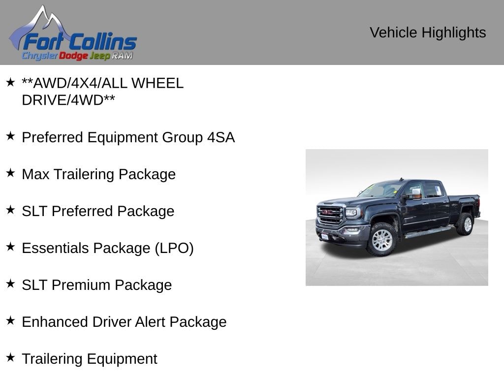 **AWD/4X4/ALL WHEEL DRIVE/4WD**, 110-Volt AC Power Outlet, 150 Amp Alternator, 1st & 2nd Row Color-Keyed Carpeted Floor Mats, 2-Speed Active Electronic AutoTrac Transfer Case, 20" x 9" Polished Aluminum Wheels, 3.42 Rear Axle Ratio, 4.2" Diagonal Color Display Driver Info Center, 4" Round Chromed Tubular Assist Steps (LPO), 6" Rectangular Chromed Tubular Assist Steps, All-Weather Floor Liner (LPO), Auto-Dimming Inside Rear-View Mirror, Auxiliary External Transmission Oil Cooler, Bose Speaker System, Chrome Bodyside Moldings, Chrome Door Handles, Chrome Mirror Caps, Color-Keyed Carpeting, Deep-Tinted Glass, Driver & Front Passenger Illuminated Vanity Mirrors, Dual-Zone Automatic Climate Control, Electric Rear-Window Defogger, Enhanced Cooling Radiator, Enhanced Driver Alert Package, Essentials Package (LPO), EZ Lift & Lower Tailgate, Forward Collision Alert, Front Frame-Mounted Black Recovery Hooks, GMC 4G LTE, GMC Connected Access, Heavier Duty Rear Springs, Heavy-Duty Rear Locking Differential, Increased RGAWR, Integrated Trailer Brake Controller, IntelliBeam Automatic High Beam On/Off Headlight, Lane Keep Assist, Leather Wrapped Heated Steering Wheel, Leather Wrapped Steering Wheel w/Cruise Controls, LED Cargo Box Lighting, LED Tailamps w/Signature, Low Speed Forward Automatic Braking, Manual Tilt/Telescoping Steering Column, Max Trailering Package, OnStar & GMC Connected Services Capable, Power Adjustable Pedals, Power Folding & Adjustable Heated Outside Mirrors, Power Sliding Rear Window w/Defogger, Power Windows w/Driver Express Up & Down, Preferred Equipment Group 4SA, Rear 60/40 Folding Bench Seat (Folds Up), Rear Wheelhouse Liners, Remote Keyless Entry, Remote Locking Tailgate, Remote Vehicle Starter System, Single Slot CD/MP3 Player, SLT Preferred Package, SLT Premium Package, Soft Folding Tonneau Cover (LPO), Steering Wheel Audio Controls, Theft Deterrent System (Unauthorized Entry), Thin Profile LED Fog Lamps, Trailering Equipment, Ultrasonic Front & Rear Park Assist, Universal Home Remote.