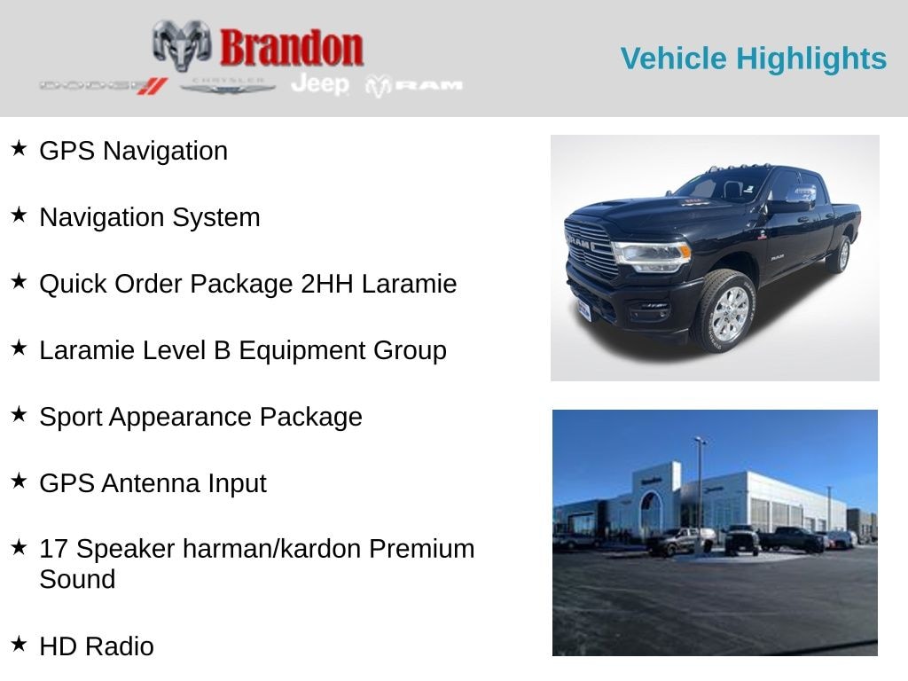 Certified. Diamond Black Crystal Pearlcoat 2024 Ram 3500 Laramie 4WD 6-Speed Automatic Cummins 6.7L I6 Turbodiesel 3500 Laramie, Cummins 6.7L I6 Turbodiesel, 4WD, 12" Touchscreen Display, 17 Speaker harman/kardon Premium Sound, 18" x 8" Polished Aluminum Wheels, 20" x 8" Polished Aluminum Wheels, 2nd Row In Floor Storage Bins, 4G LTE Wi-Fi Hot Spot, Alexa Built-In, Apple CarPlay, Auto Adjust In Reverse Exterior Mirrors, Auto Dimming Exterior Passenger Mirror, Auto High Beam Headlamp Control, Auto Power-Folding Mirrors, Auto-Dimming Exterior Mirrors, Black Interior Accents, Blind Spot & Cross Path Detection, Body Color Grille Surround, Center Hub, Chrome Exterior Mirrors, Connected Travel & Traffic Services, Connectivity - US/Canada, Disassociated Touchscreen Display, Exterior Mirrors Courtesy Lamps, Exterior Mirrors w/Heating Element, Exterior Mirrors w/Memory, Exterior Mirrors w/Supplemental Signals, Foam Bottle Insert (Door Trim Panel), For Details Visit DriveUconnect.com, For More Info, Call 800-643-2112, Forward & Reverse Utility Lights, Front LED Fog Lamps, Global Telematics Box Module (TBM), Google Android Auto, GPS Antenna Input, GPS Navigation, HD Radio, Heated Second Row Seats, Integrated Voice Command w/Bluetooth, Laramie Level B Equipment Group, LED Reflector Headlamps, LED Tail Lamps, Mirror Running Lights, Navigation System, Off-Road Information Pages, ParkSense Front/Rear Park Assist System, Power Adjust Mirrors, Power Adjustable Pedals w/Memory, Power Heat Fold Memory Telescopic Mirrors, Power Telescoping Mirrors, Power-Adjustable Convex Aux Mirrors, Quick Order Package 2HH Laramie, Radio: Uconnect 5 Nav w/12.0" Display, Rain Sensitive Windshield Wipers, Rear Power Sliding Window, Rear Window Defroster, Remote Tailgate Release, Selectable Tire Fill Alert, SiriusXM Radio Service, SiriusXM w/360L, Sport Appearance Package, Sport Decal, Sport Performance Hood, Trailer Tow Pages.